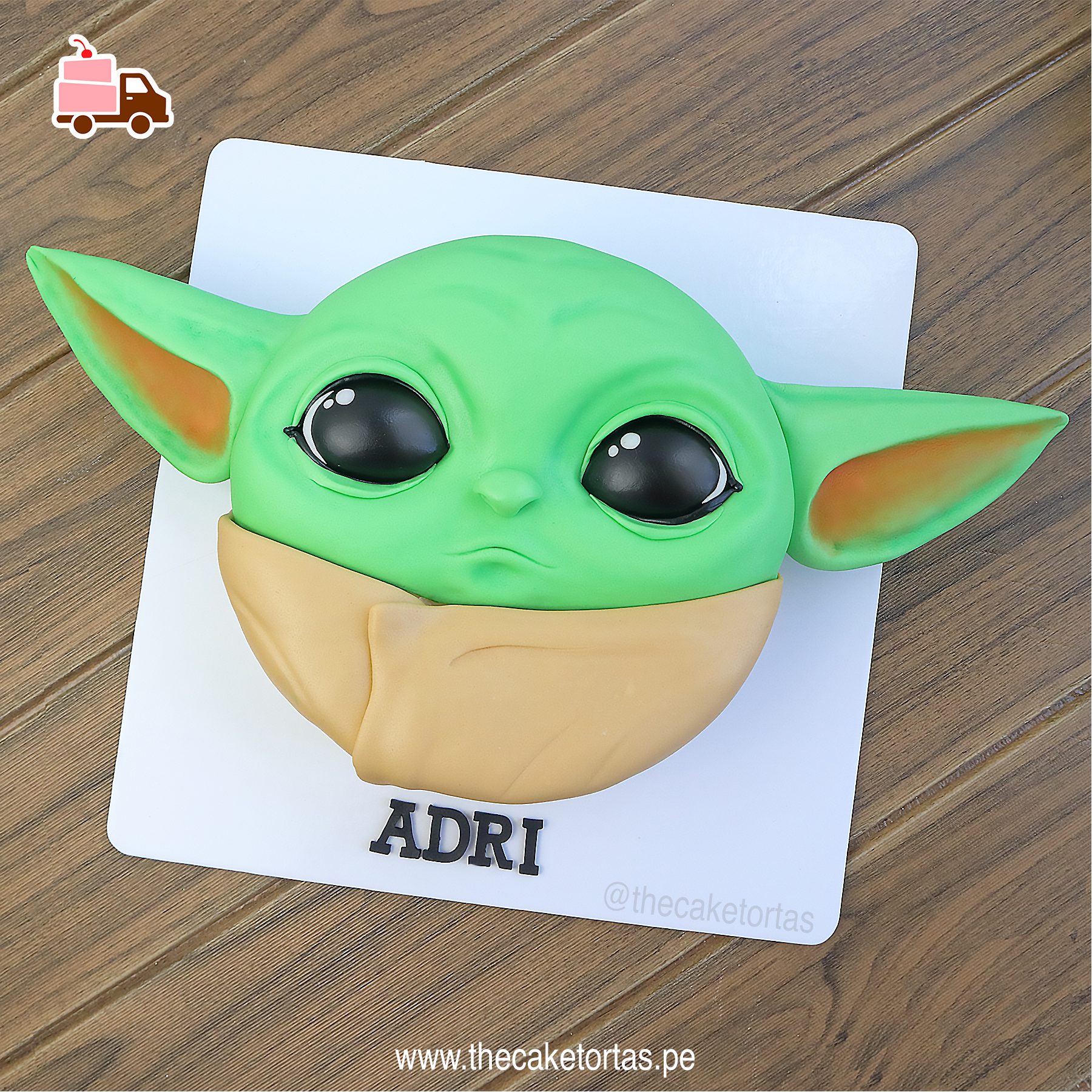 torta de diámetro 20cm y 8 cm de alto rinde para 18 porciones. tallada y Forrada en masa fondant con el diseños de baby yoda.